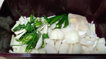- 준비한 재료를 큰 항아리나 용기에 담고, 양념물을 부어주면 됩니다.
