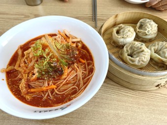 비빔국수의 매콤하고 새콤한 맛과 만두의 고소하고 담백한 맛이 완벽하게 어우러져 풍부한 맛을 선사합니다.