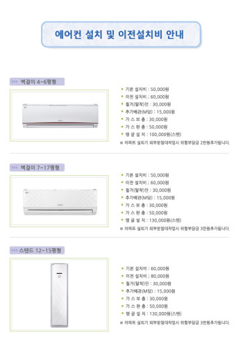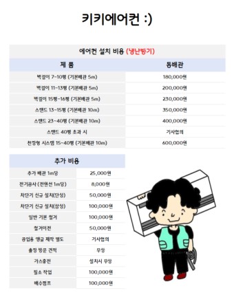 설치비용은 에어컨 종류에 따라 기본비용이 달라지고, 추가 작업이 필요한 경우에는 추가 비용이 발생합니다. 예를 들어, 벽타공이나 배관 연장 같은 작업은 추가비용으로 산정됩니다.