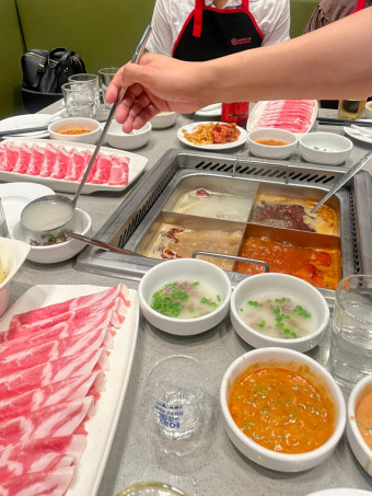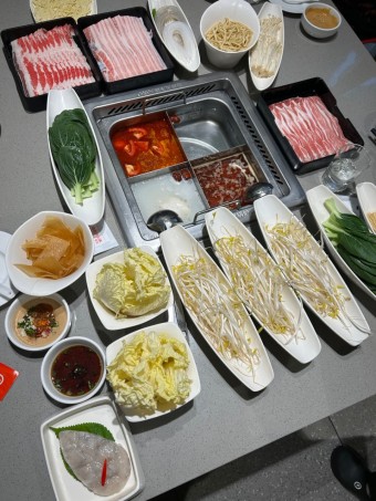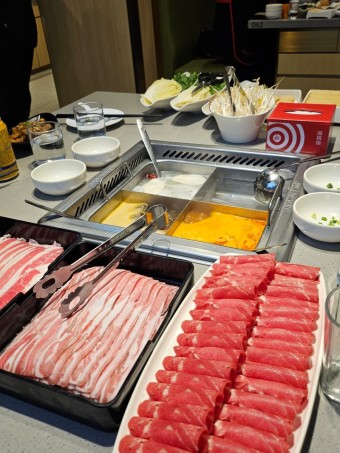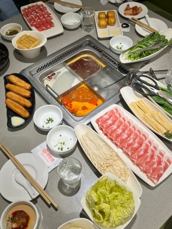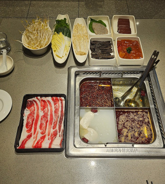주요 메뉴는 중국 전통 핫팟이며, 다양한 육류, 해산물, 채소, 소스 선택이 가능합니다.