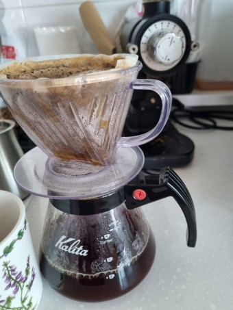- 물을 서서히 부으며 커피를 추출한다.