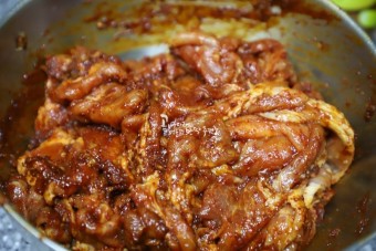 - 양념에 재운 돼지고기를 중불에서 볶습니다.